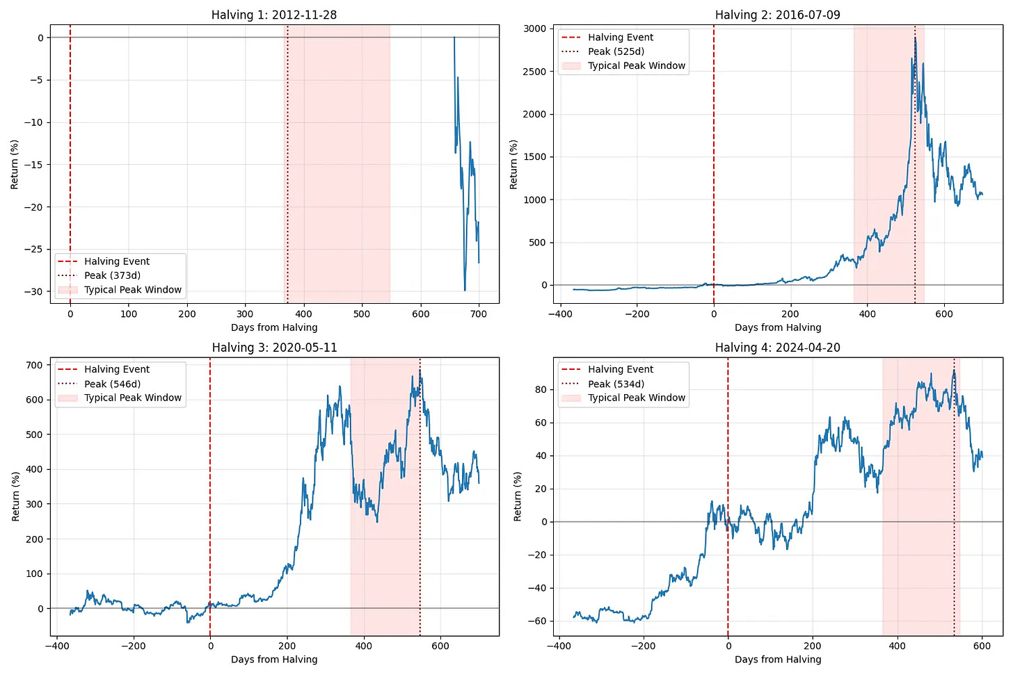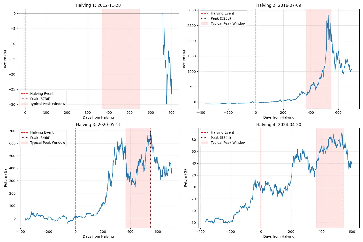 Key Observation: The 2024 cycle peak occurred at 534 days - right in the historical 12-18 month window (365-547 days). Returns continued to diminish as expected, but the pattern held remarkably well.
